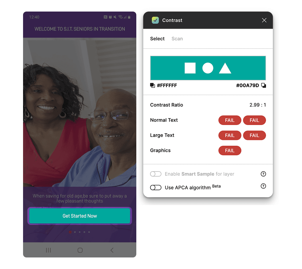 The fill colors for both the CTA button's container and text failed to satisfy a 4.5:1 contrast ratio.